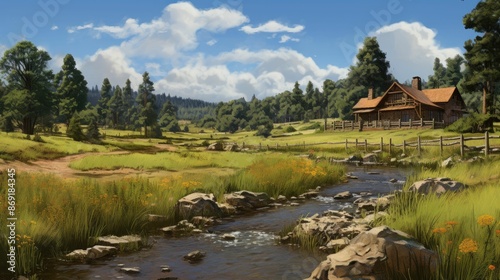 Fototapeta premium A beautiful landscape image of a cabin in the mountains. The cabin is made of...