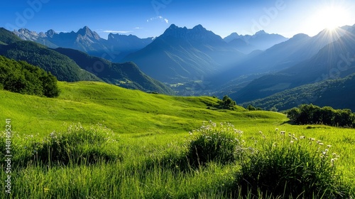 © Berkah1789, Naklejka premium A beautiful landscape of mountains and green grassy fields