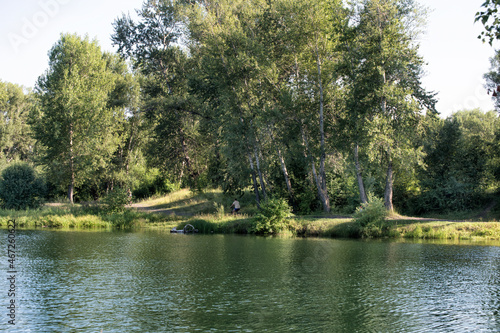© Marina, Naklejka premium A beautiful landscape of the river surrounded by trees on a sunny summer day under blue sky.