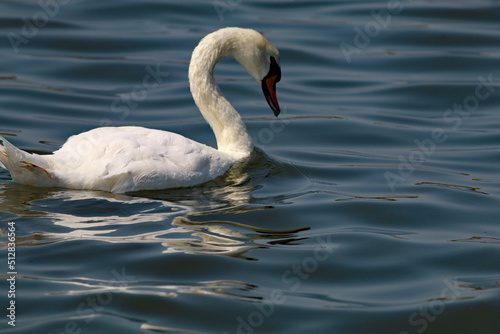 Fototapeta premium A beautiful landscape shot of a white swan on a lake at Crosby Marina, near Crosby beach. This photo was taken on a very hot and sunny day.