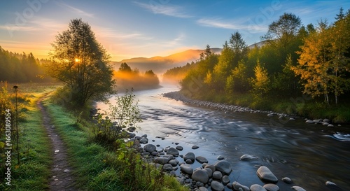 © minwoo, Fototapeta premium A beautiful landscape with a flowing river. Generative AI.
