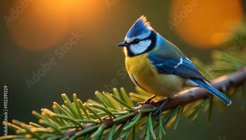 Obraz premium a beautiful larch, a blue tit with a cute view closed up portrait
