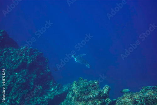 Fototapeta premium ゆったり泳ぐ美しく大きなアオウミガメ(ウミガメ科)。東京都伊豆諸島式根島-2020年10月3日A beautiful, large Green...