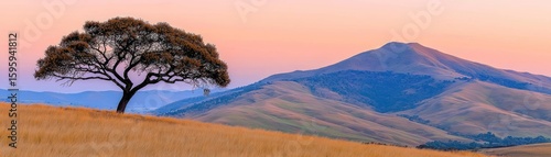 Fototapeta premium A beautiful large tree stands before a mountain at sunset