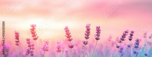 Fototapeta premium A beautiful lavender field bathed in soft sunrise light, creating a tranquil...