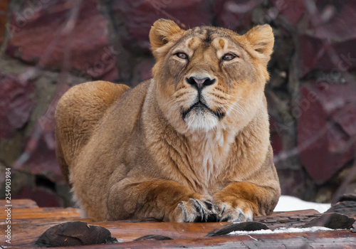 Naklejka premium A beautiful lioness female lies and looks , dark background.