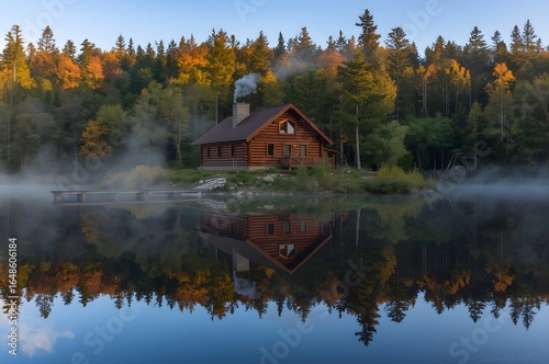 © Paull, Obraz premium A beautiful log cabin on a lake, with reflections in the water.
