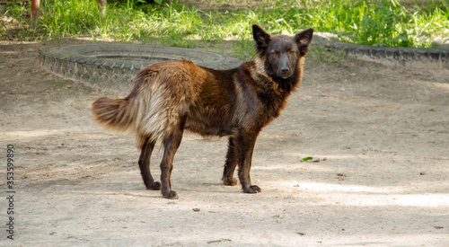 © Tam Sam, Naklejka premium a beautiful lonely belgian dog ​​of dark brown, gray and black colors in a clearing looks with sad eyes into the camera lens, looks a bit like a wolf
