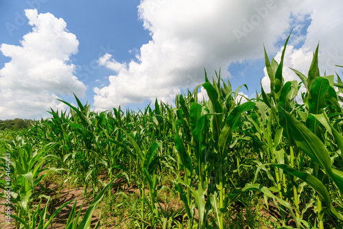 Fototapeta premium A Beautiful Lush Green Cornfield Flourishing Under a Bright and Vibrant Blue Sky