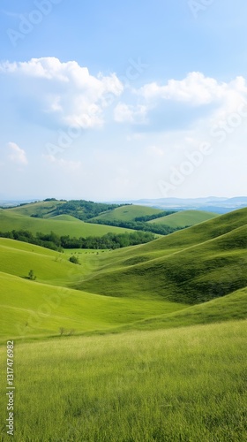 Fototapeta premium A beautiful, lush green field with a clear blue sky above. The sky is dotted with clouds, giving the scene a peaceful and serene atmosphere. The field is vast