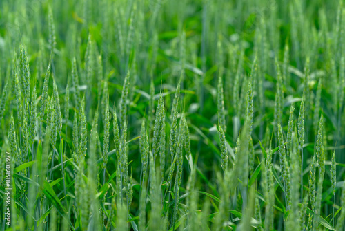 Fototapeta premium A Beautiful Lush Green Wheat Field Enhanced with Sparkling Dew Drops in the Morning Light