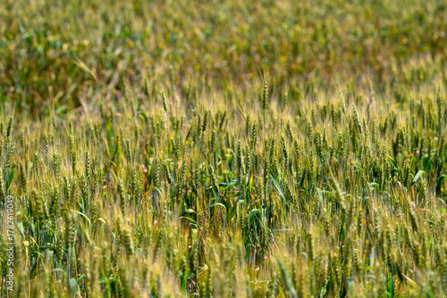 Obraz premium A Beautiful, Lush Green Wheat Field Spreading Under the Clear Blue Skies of Summer