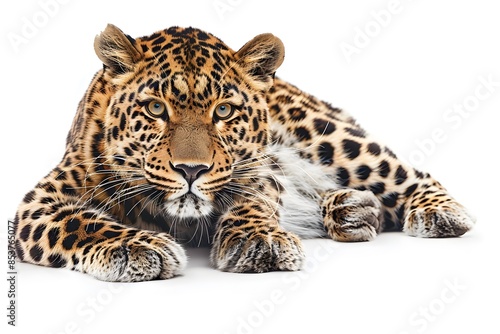 © Maryna, Obraz premium A beautiful majestic leopard lies, isolated on a white background. Looking into the camera. Animal protection concept.