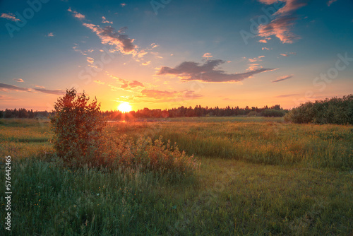Fototapeta premium A beautiful may sunset landscape. Spring meadow under the beautiful sky with...