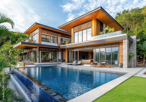© thiquynh, Fototapeta premium A beautiful modern house with large windows and a swimming pool in the front yard