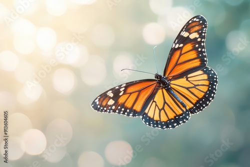 Fototapeta premium A beautiful monarch butterfly gracefully fluttering in a dreamy, soft-focus...