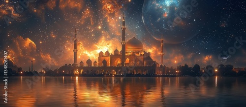 © novri, Obraz premium A beautiful mosque scene reflecting on a tranquil body of water