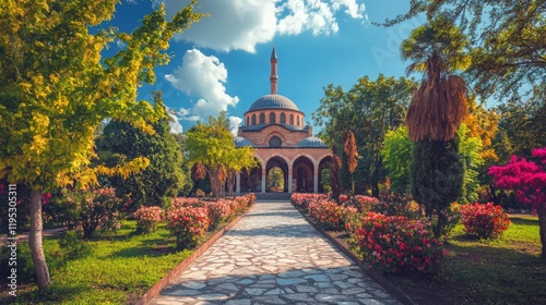 Fototapeta premium A beautiful mosque with a garden pathway surrounded by trees and colorful...