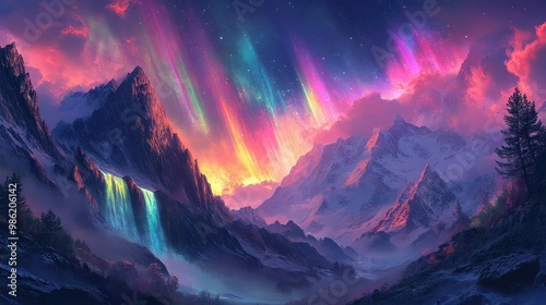 © Dumrongkait, Obraz premium A beautiful mountain landscape with a waterfall and a sky full of colorful auroras. Scene is serene and peaceful, with the natural beauty of the mountains