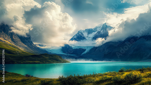 © Toey Meaong, Naklejka premium A beautiful mountain range with a large body of water in the foreground
