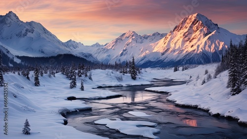 Obraz premium A beautiful mountainous sunset scene in winter.