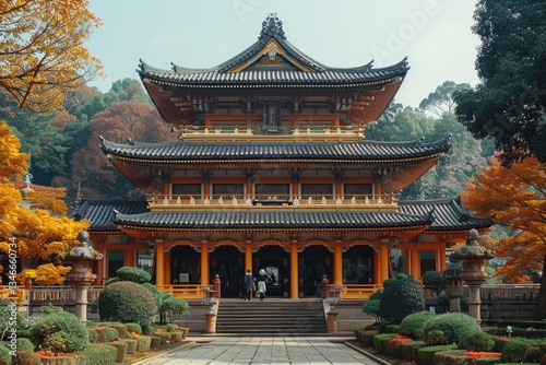 © NikahGeh, Fototapeta premium A beautiful multicolored temple in the midst of fall foliage