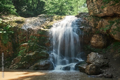 Fototapeta premium A beautiful natural waterfall in a mountain landscape. Clean mountain river