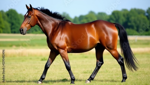 © ArtPro, Fototapeta premium A beautiful Orlov Trotter horse walking gracefully in a lush green field.