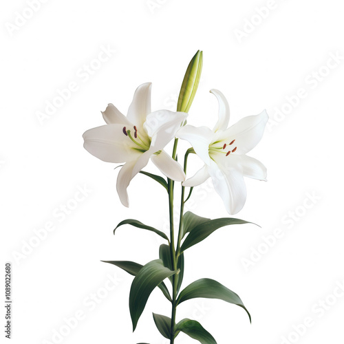 © Kamonwan, Naklejka premium A beautiful pair of white lilies with vibrant green leaves, symbolizing purity and beauty., isolated on a transparent background.