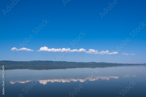 © Anton Papulov, Fototapeta premium A beautiful panorama shot over a deep blue lake and sky
