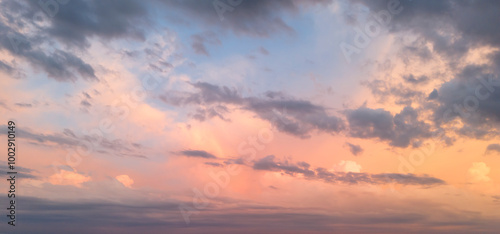 Fototapeta premium A beautiful pastel-colored evening sky with soft clouds illuminated by the warm light of the setting sun, creating a tranquil and serene atmosphere.