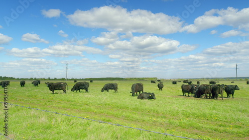 Obraz premium A Beautiful Pastoral Landscape Featuring Grazing Cattle Beneath A Bright Blue Sky