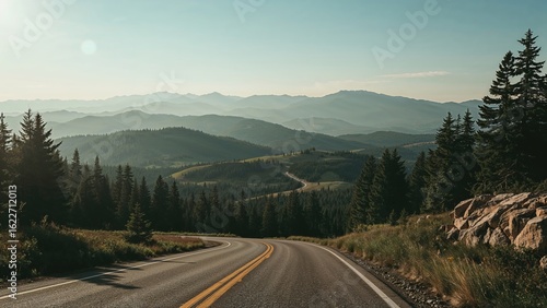 © AIArtistry, Fototapeta premium A beautiful pathway meandering through lush forests and undulating terrain, approaching mist-shrouded mountains in warm sunlight.