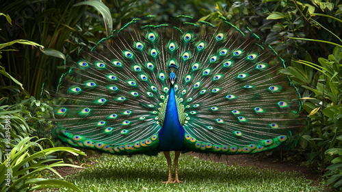 Obraz premium A beautiful peacock displaying its colorful plumage in a lush garden