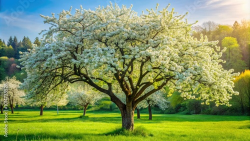 © Autun, Fototapeta premium A beautiful pear tree blooms with white flowers, set against a vibrant green backdrop, perfect for nature and spring photography lovers seeking inspiration.