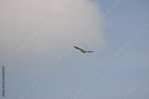 © chytu, Fototapeta premium a beautiful pelican bird is flying on the sky, close up view of the pelican