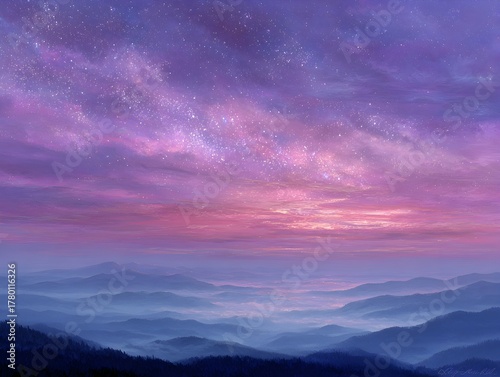 © patiporn, Fototapeta premium A beautiful pink and purple nebula sky stretches above a misty mountain range under starry conditions.