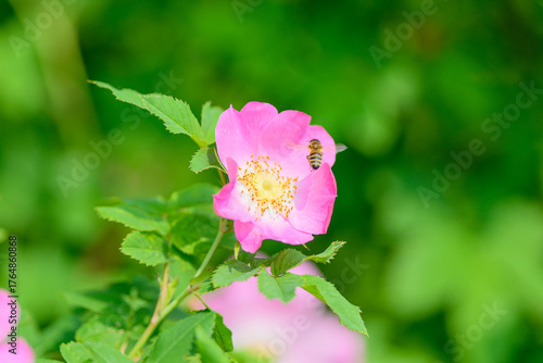 Obraz premium A Beautiful Pink Flower with a Bee perched on it, set against a Lush Green...