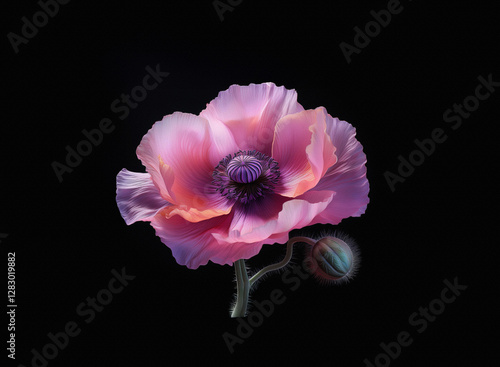 © Echo of Dreams, Fototapeta premium A beautiful pink flower with a deep purple center and a small bud is isolated against a contrasting black background, creating a striking visual.