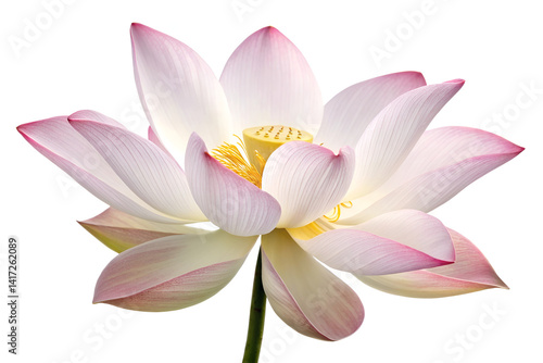 © Iatazaz, Naklejka premium A beautiful pink lotus and water lily blossom, aquatic flora often called waterlily, bloom as lovely floral petals isolated against white, showcasing nature's beauty in the garden pond during summer