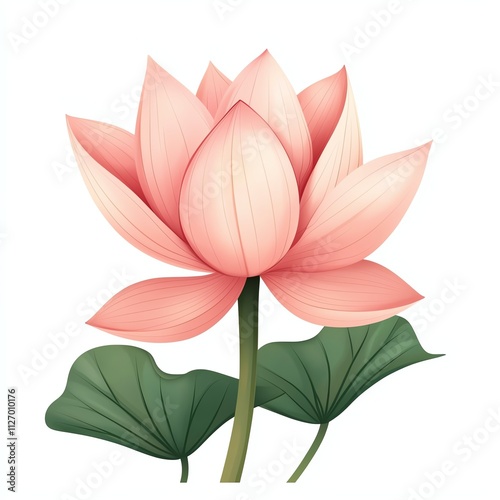 © padungsak, Fototapeta premium A beautiful pink lotus flower with green leaves, symbolizing purity and tranquility, elegantly displayed against a clean white background.