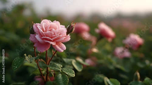 Naklejka premium A beautiful pink rose covered in morning dew drops glistening in the soft dawn light surrounded by a field of similar blooms