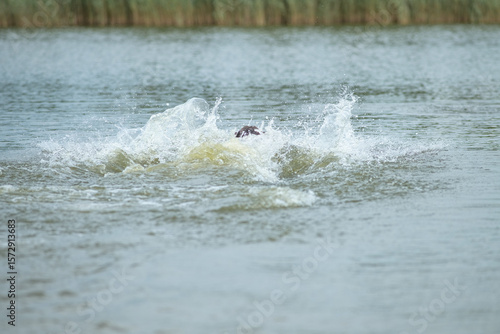© shymar27, Fototapeta premium A beautiful purebred American Staffordshire Terrier plays in the water.