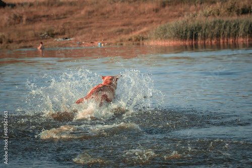 Obraz premium A beautiful purebred Labrador plays in a summer lake.