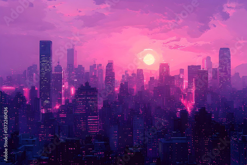 © ibnu, Obraz premium A beautiful purple pink city sunset with many buildings in the distance