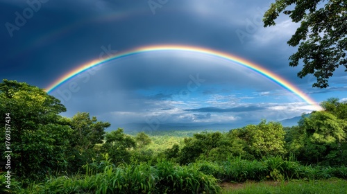 Naklejka premium A beautiful rainbow arches across a vibrant sky, creating a breathtaking...