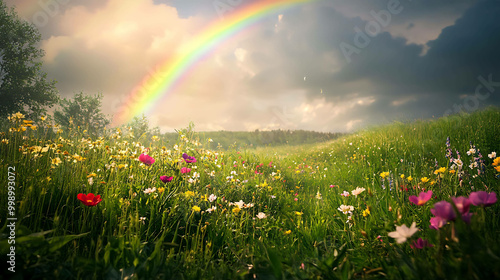 Naklejka premium A beautiful rainbow shines over a field of wildflowers after a summer rain.