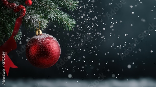 Obraz premium A beautiful red Christmas ornament dangles from a snow-dusted pine tree...