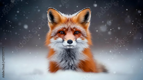 © Earny, Obraz premium A beautiful red fox emerging from the snowy landscape, showcasing its vibrant fur and striking features in a tranquil winter setting.