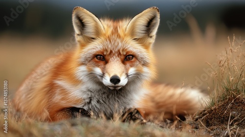 Naklejka premium A beautiful red fox rests gracefully amid golden grass, showcasing its striking fur and intense gaze, embodying the wild spirit of nature.